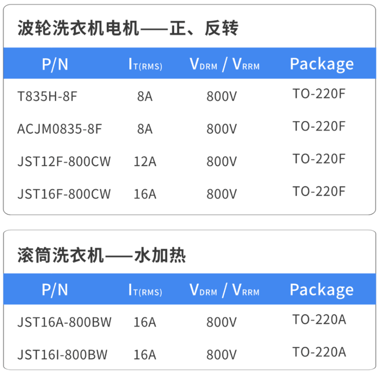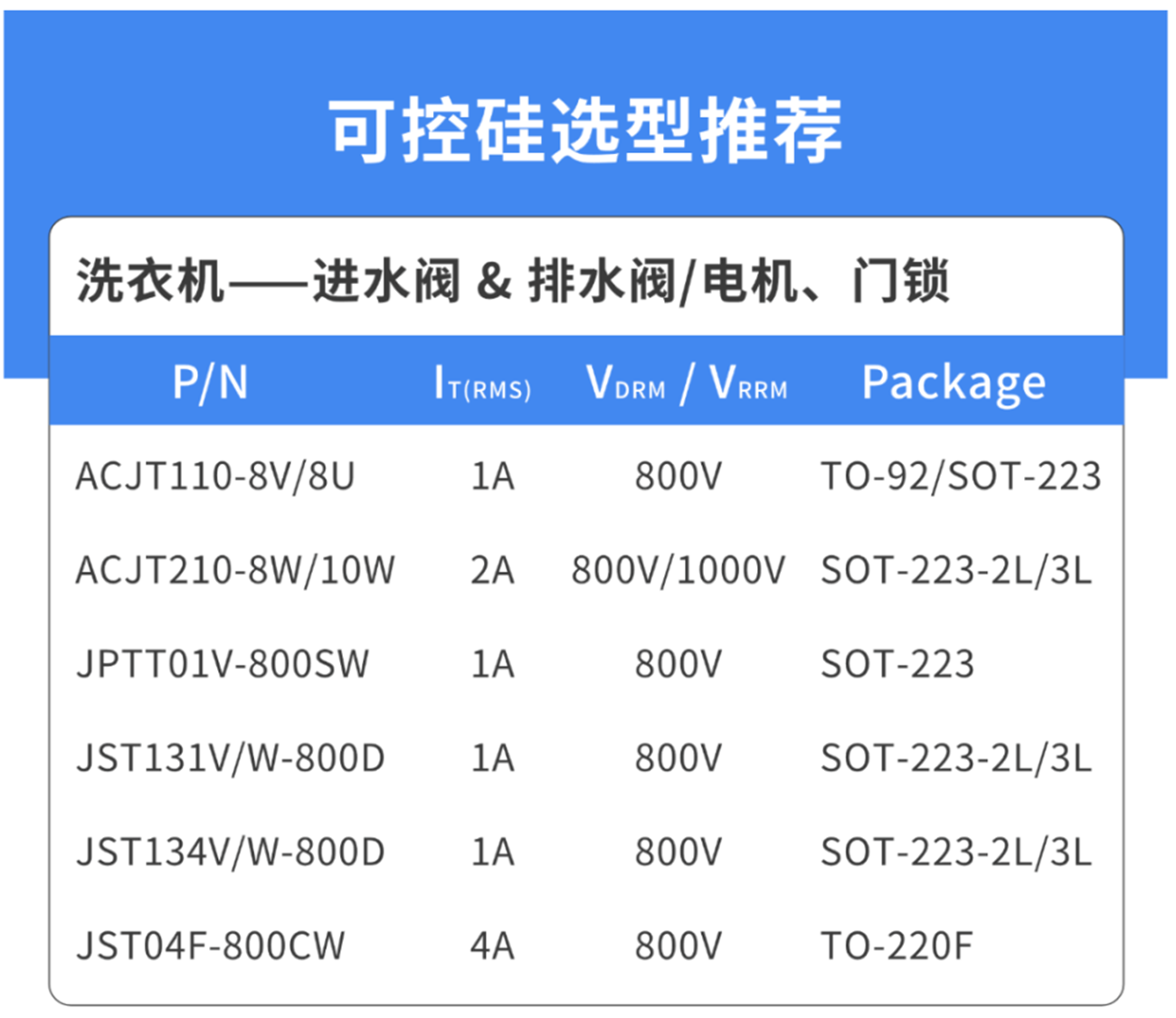 在洗衣机的电路系统中,可控硅是关键元件。MYBALL迈博微电针对洗衣机不同控制负载的需求,提供了丰富的可控硅产品选择。在进水阀和排水阀(电机或泵)领域,JPTT01V – 800SW、JST131、JST134、ACJT210、JST04 等型号可控硅,以 1A、2A或4A 的电流和 800V 的耐压值,配合 TO – 92、SOT – 223、TO-220F 等封装形式,稳定控制水流进出。在电机正反转控制方面,T835H-8F、JST12X – 800CW 等 8A – 12A 大电流可控硅,确保电机强劲运转,适应各种电机功率。在滚筒洗衣机的门锁开关和加热环节,同样有适配的可控硅产品,保障洗衣过程的安全与高效。类比同行可控硅,MYBALL迈博微电的可控硅抗雷击性能表现卓越,优于部分竞品,有效提升了洗衣机的稳定性和耐用性。