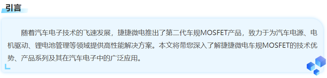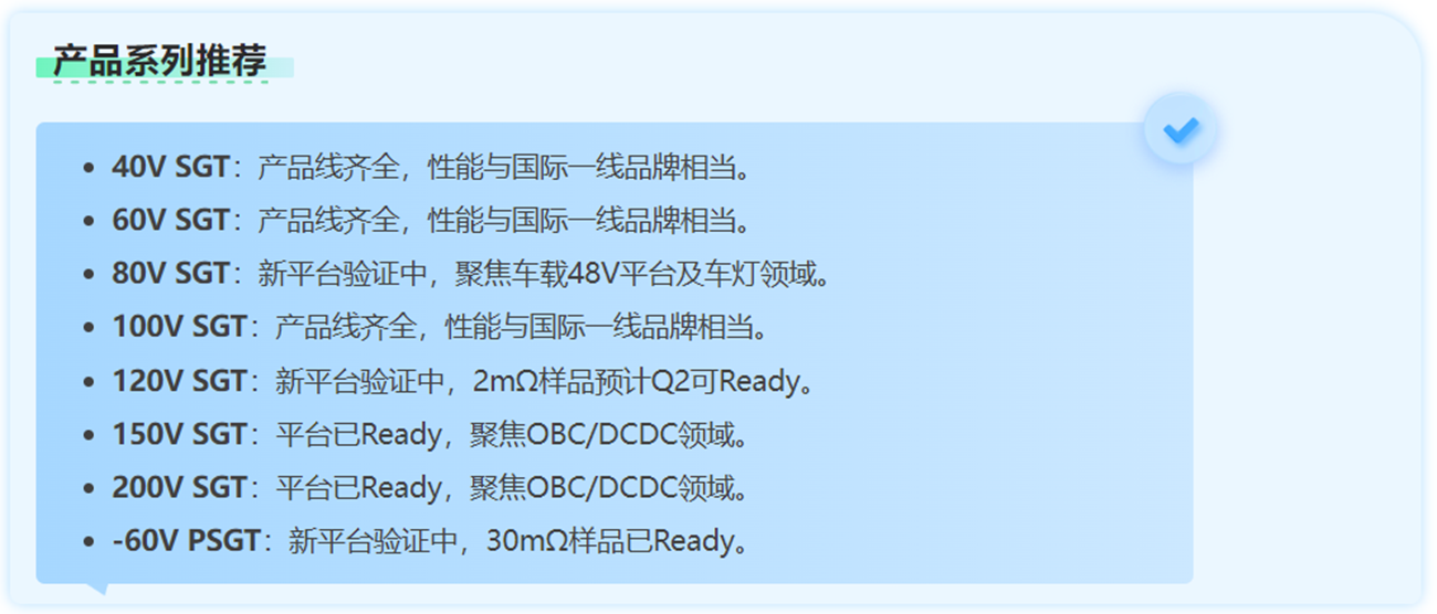 目前,JJM 已成功实现 200多款 SGT车规产品的量产,并持续发力,在 LFPAK 和 Top – Cooling 封装方面积极布局,不断开发新品,以创新引领行业发展。